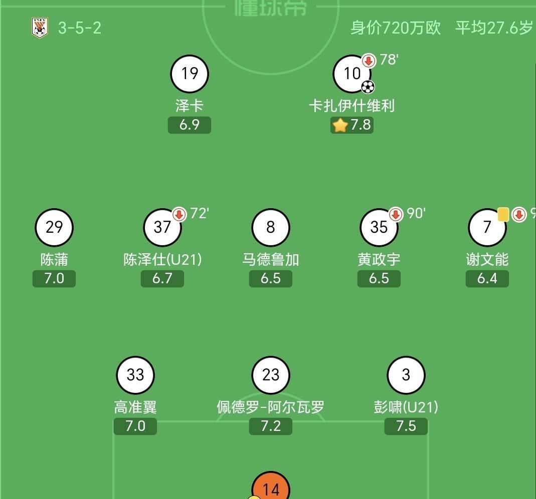 除了卡扎伊什维利和彭啸这两位耀眼的明星,其他球员也各司其职,共同为这场胜利贡献力量。门将王大雷获得了7.3分,他的稳健发挥是球队能够零封对手的重要保障,多次关键扑救力保球门不失。中场球员阿尔瓦罗得到7.2分,他在中场的调度和拦截为防线减轻了不少压力。后卫高准翼和前锋陈蒲均获得了7.0分,前者在边路的积极奔跑攻防俱佳,后者则用不懈的跑动牵扯着对手的防线分,他在前场的支点作用明显,但临门一脚的感觉还有提升空间。同样首发的U21小将陈泽仕得到6.7分,他在中场的积极拼抢和那脚导致进球的长传发起,都展现了自己的价值。马德鲁加和黄政宇均得到6.5分,谢文能则得到6.4分。替补登场的球员由于上场时间有限,评分普遍在6.4分左右。