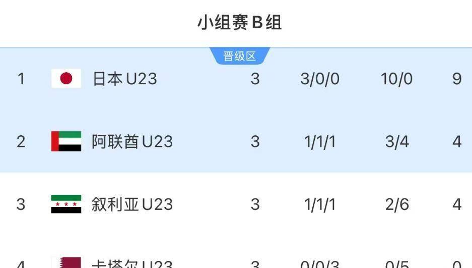 日本队小组赛三战全胜,打进10球且一球未失,展现出绝对的统治力。 阿联酋凭借净胜球优势力压同积4分的叙利亚,惊险晋级。 叙利亚成为目前积分最高(4分)的出局球队,卡塔尔三战全败垫底出局。