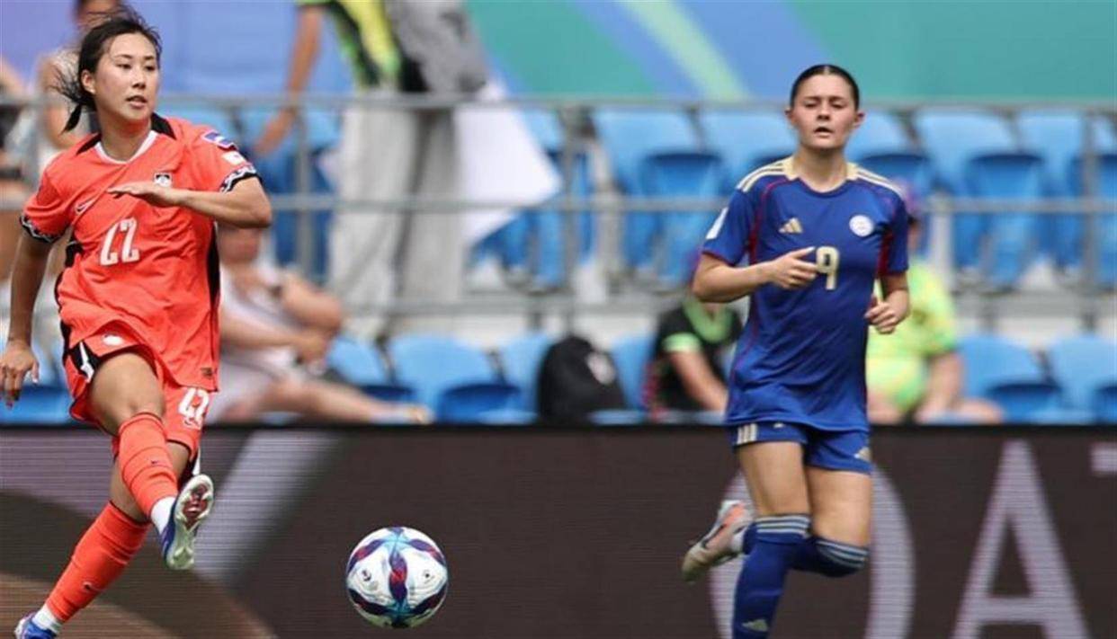 比赛从一开始就呈现出一边倒的局面。 韩国女足控球率迅速上升到70%以上。 第12分钟,韩国队在中场组织进攻,8号金信智从中场位置突然前插,送出一记直塞球。 皮球穿透了菲律宾队的防线号朴洙正在禁区内面对来球,巧妙地用脚后跟一漏。 这个动作完全骗过了菲律宾的后卫,15号全佑静在点球点附近得球。 她转身调整一步,左脚抽射。 皮球贴着草皮,直窜球门右下角。 菲律宾门将奥利维娅·麦克丹尼尔扑救不及,韩国队1比0领先。