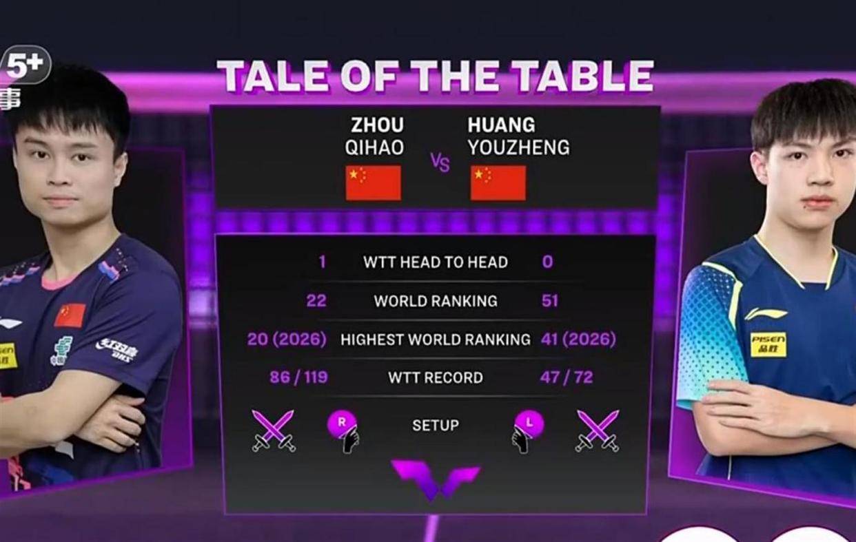 女单赛场蒯曼轻松过关后,紧接着在上午11点35分,男单赛场迎来了首场国乒“内战”。由29岁的周启豪对阵20岁的小将黄友政。这场比赛因为抽签结果,注定有一名国乒选手要“一轮游”。周启豪世界排名第22位,今年1月刚刚在WTT多哈球星挑战赛上夺得男单冠军,状态正佳。黄友政世界排名第51位,是2024年全国锦标赛男单冠军,凭借WTT提名获得本次参赛资格。两人在今年1月就有过交手,当时周启豪以3-1获胜。比赛开始后,双方没有过多试探。周启豪进入状态更快,首局一度取得6-2的领先,并率先以10-6拿到四个局点。然而,年轻的黄友政展现了极强的韧性,他通过积极的搏杀和高质量的反手拧拉,不可思议地连追4分,将比分扳成10-10平。关键时刻,经验更丰富的周启豪稳住了阵脚,他通过发球抢攻和相持中的变线惊险拿下首局。第二局,周启豪在中后段逐渐拉开比分,以11-6再下一城,大比分2-0领先。