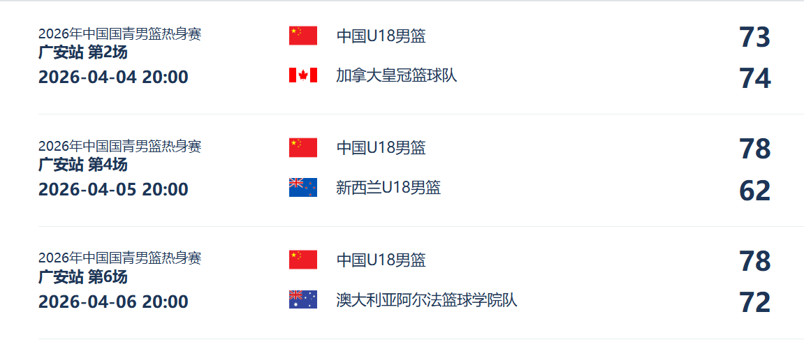 这一次国青男篮热身赛,主要是为了备战接下来的U18亚洲杯。这一次中国队邀请了三支球队参加,分别是澳大利亚阿尔法学院队,加拿大皇冠篮球队,以及U18新西兰男篮。在过去两场比赛,中国队获得了1胜1负的战绩,热身赛首秀,中国队以73-74不敌加拿大队,遭遇开门黑。不过,在随后的G2战,他们又以78-62成功击败了U18新西兰男篮,收获此次热身赛第一场胜利。
