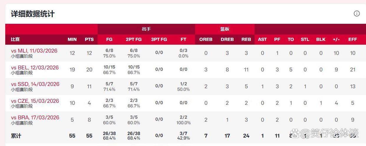 2026年的女篮世界杯资格赛,张子宇继续在国家队扮演着重要角色。她场均出战10.9分钟,贡献11分和4.8个篮板,投篮命中率维持在68.4%的高水准。这些数据清晰地表明,尽管在成年队比赛时间有限,但她在有限的出场时间内保持着极高的进攻效率和篮下终结能力。