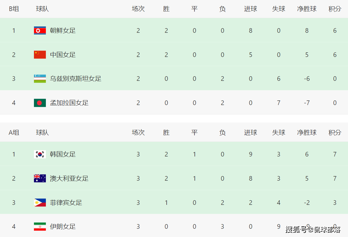 A组3轮全部结束之后,韩国女足、澳大利亚女足同积7分,韩国女足净胜球占优,锁定第一,澳大利亚女足锁定第二,菲律宾女足积3分,锁定第三,伊朗女足积0分,锁定垫底。