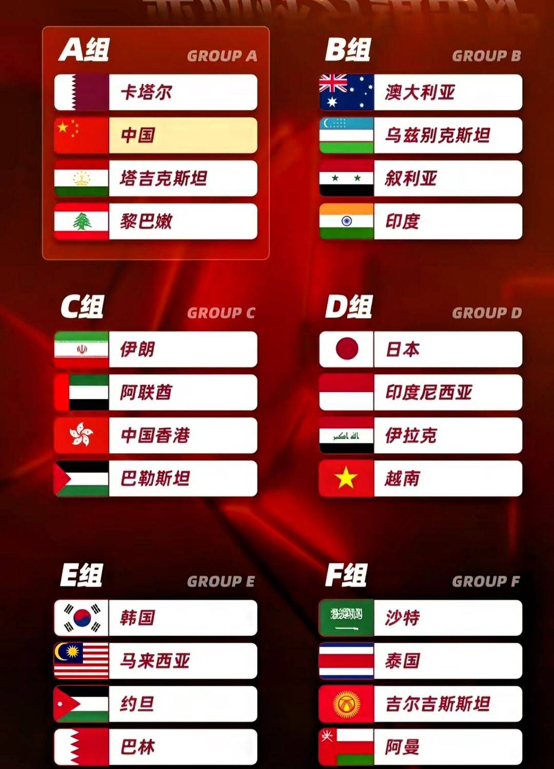 本届赛事分档已明确:第一档为沙特、日本、韩国、伊朗、澳大利亚、乌兹别克斯坦(均为世界杯参赛队);第二档涵盖卡塔尔、伊拉克、阿联酋、约旦、阿曼、叙利亚(其中伊拉克、卡塔尔、约旦同样晋级世界杯,其余西亚球队实力也不弱);第三档包括巴林、泰国、国足、巴勒斯坦、越南;第四档则有吉尔吉斯斯坦、朝鲜、黎巴嫩也门、印尼、科威特、新加坡(印尼、朝鲜等队近年表现不俗)。