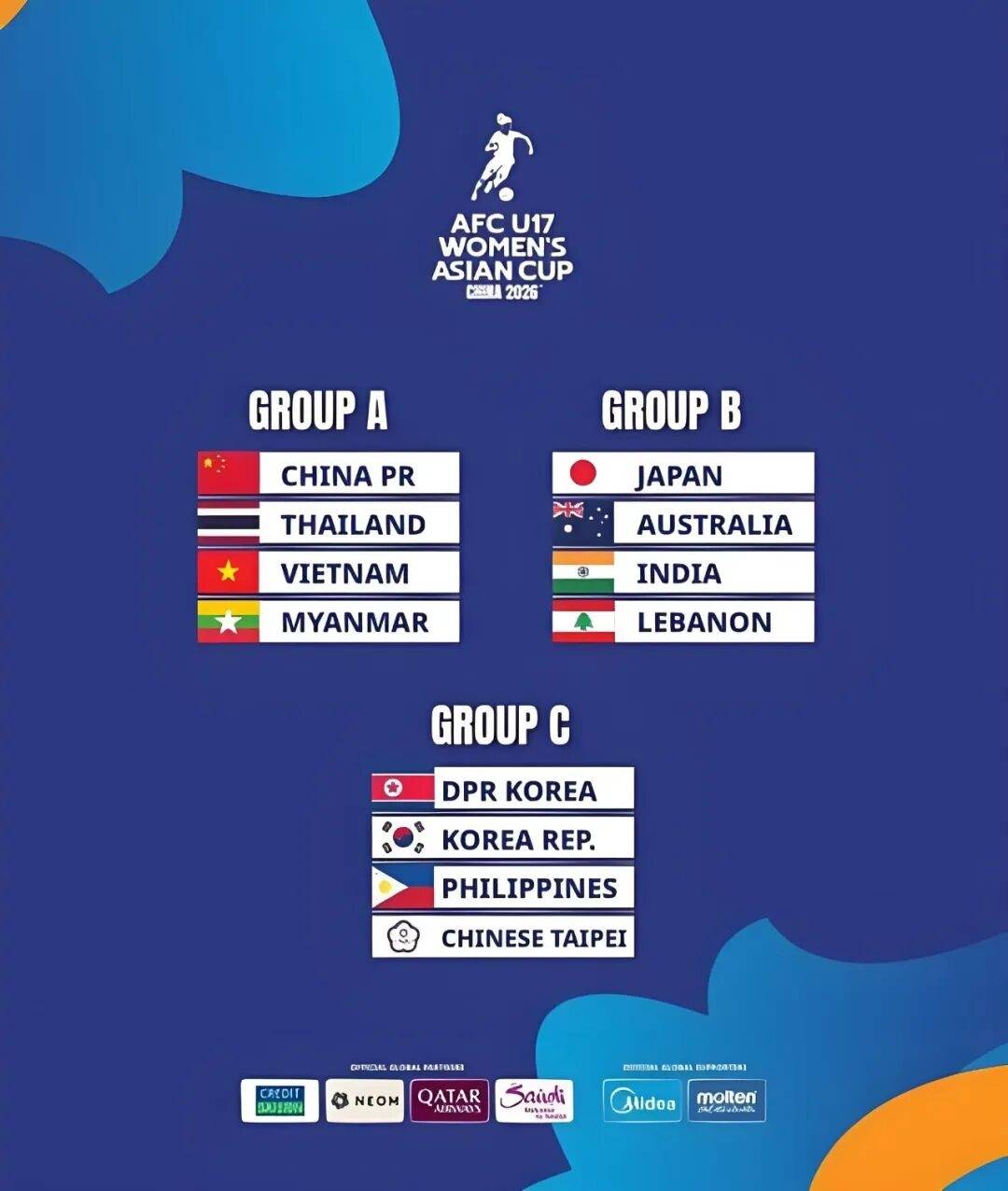 2026年U17女足亚洲杯将于5月1日至17日在江苏苏州举行,东道主中国队与泰国、越南、缅甸同分在A组。12支球队分成3组,赛事前四名直接获得2026年摩洛哥U17女足世界杯的参赛资格。