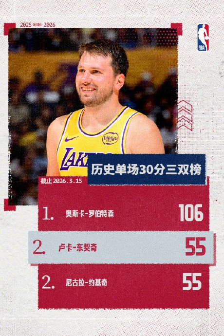 关键表现:在湖人主场对阵掘金的加时赛中,东契奇在最后0.5秒面对双人包夹,以一记高难度后仰中投完成绝杀,帮助湖人127-125险胜。他全场贡献30分11篮板13助攻的三双数据,生涯30+三双次数(55次)追平约基奇,并列历史第二。